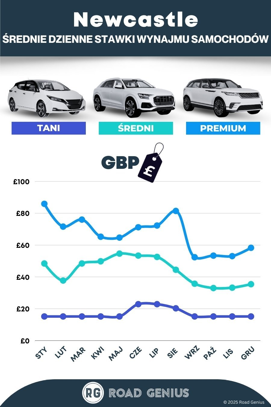 Średnio wynajem samochodu w Newcastle kosztuje około €55 za dzień, przy czym najtańsze oferty zaczynają się od €12 za dzień.