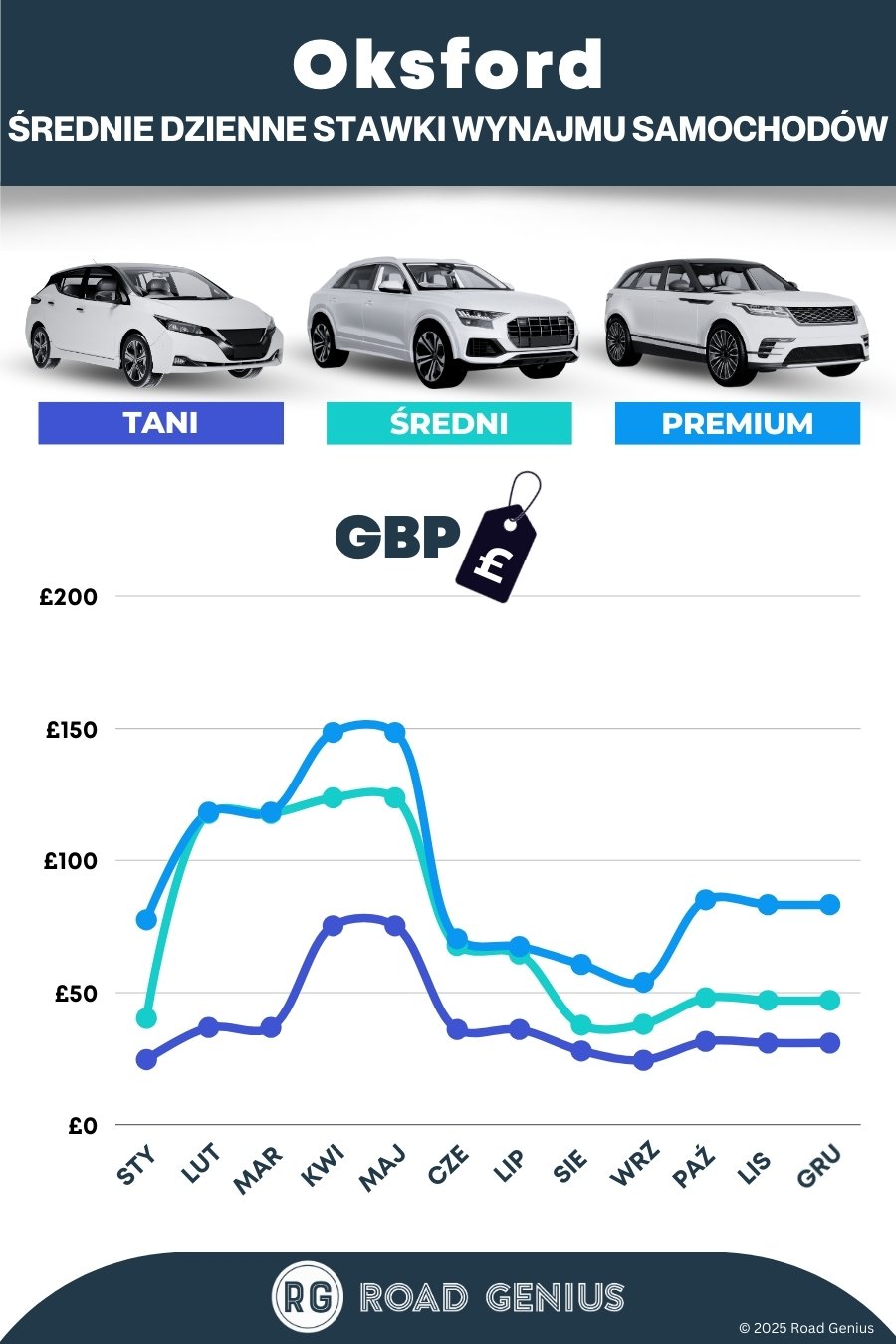 Porównaj lokalizacje i wypożyczalnie. Sprawdź ceny w centrum Oksfordu, na lotnisku Kidlington (OXF) i na Heathrow. Heathrow jest często o około 30% droższe, a ceny w centrum miasta rosną w okresach największego ruchu. Lotnisko OXF bywa tańsze i jest mniej zatłoczone.