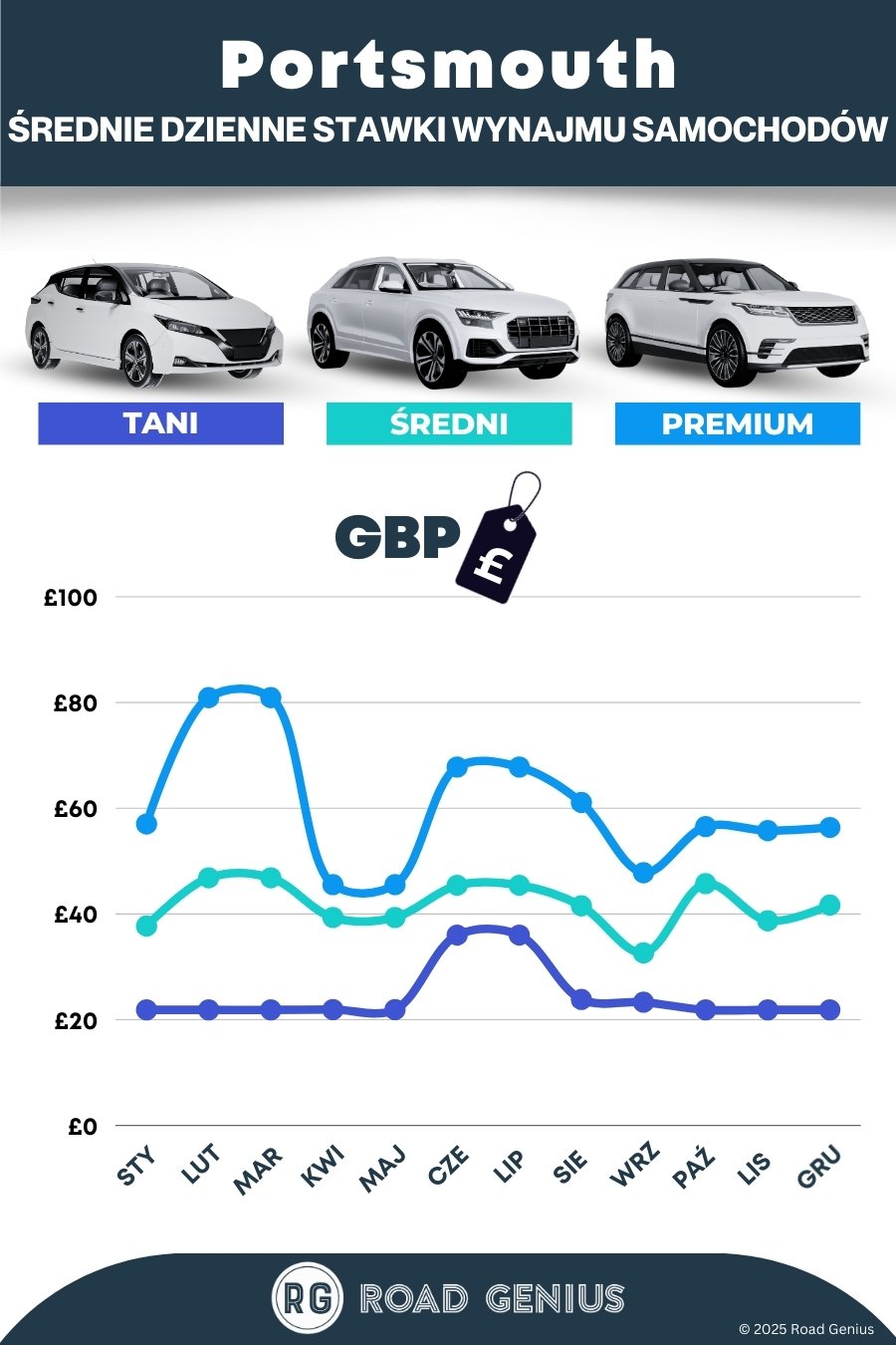 Z Road Genius znajdziesz atrakcyjne oferty wynajmu samochodów w Portsmouth. Sprawdź aktualne ceny SUV-ów, hatchbacków i minivanów, a następnie zarezerwuj auto bez opłat rezerwacyjnych. Porównaj oferty z punktów odbioru w Portsmouth Harbour, Southsea i Lakeside, skąd łatwo dotrzesz do autostrad A3 i M27 lub na prom na wyspę Wight. Zaplanuj odbiór przed 18:00, ponieważ wiele biur w mieście zamyka się wcześnie. Warto też wiedzieć, że samochody osobowe są zwolnione z opłat w Strefie Czystego Powietrza, a wiele wypożyczalni oferuje możliwość całodobowego zwrotu pojazdu.
