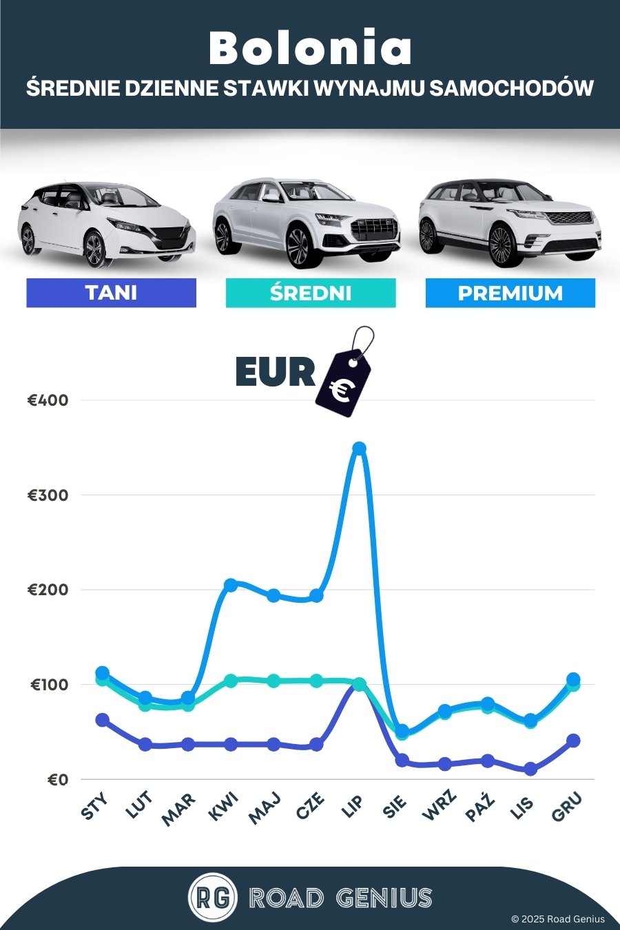 Średnio wynajem samochodu w Bologna kosztuje około €85 dziennie, a najtańsze oferty zaczynają się od €11 dziennie.