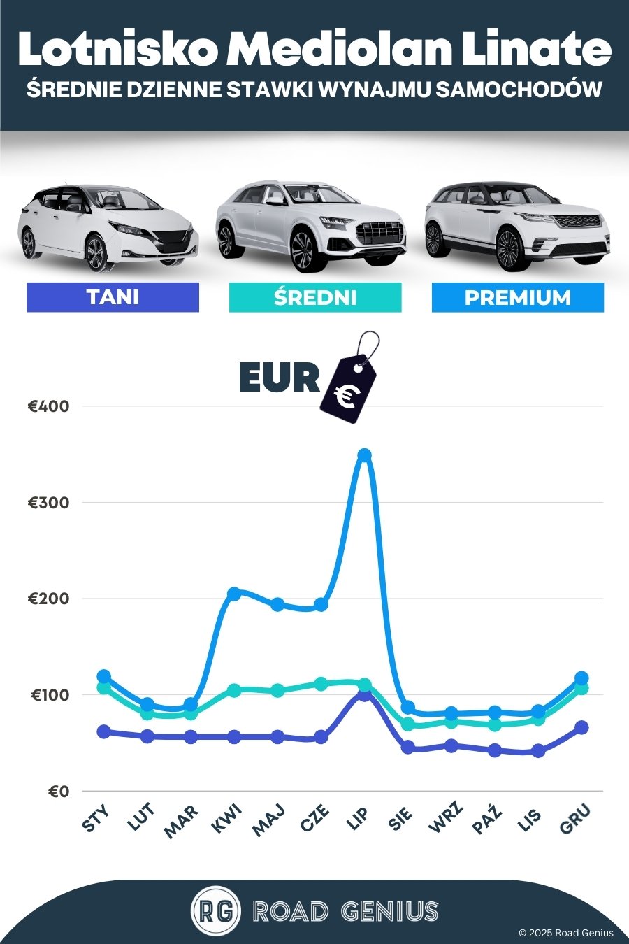 Porównaj odbiór na lotnisku i w mieście. Wynajem na lotnisku wiąże się z dopłatą w wysokości 16–18%. Jeśli najpierw zatrzymujesz się w Mediolanie, odbierz samochód w mieście, aby uniknąć tej opłaty i nie płacić za dni, w których nie korzystasz z auta. Pamiętaj jednak o doliczeniu kosztów dojazdu pociągiem Malpensa Express lub taksówką.