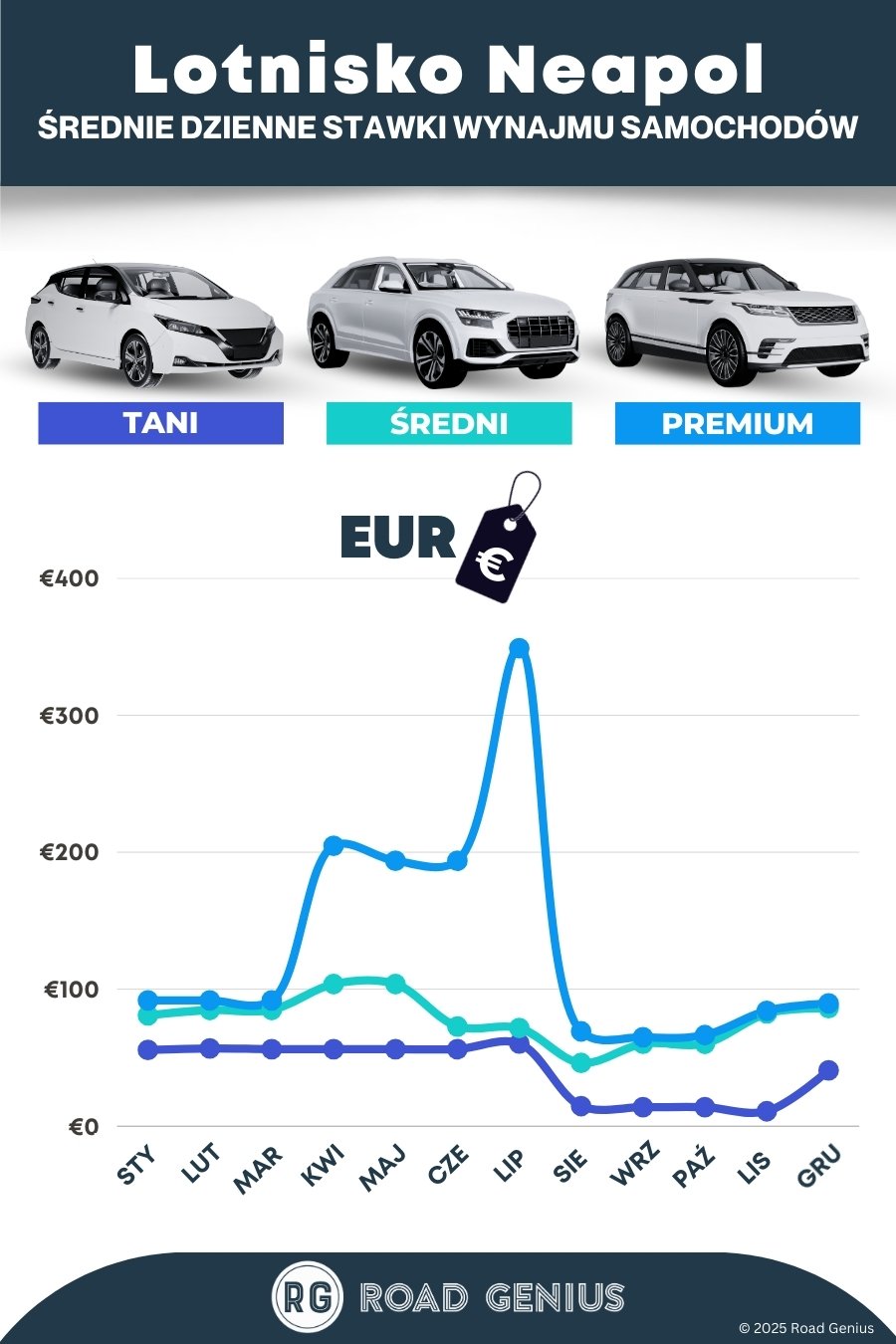 Z Road Genius porównasz ceny wynajmu samochodów od największych firm na Międzynarodowym Lotnisku w Neapolu (NAP). W ofercie znajdziesz wszystko – od aut kompaktowych po luksusowe SUV-y i minivany, a to wszystko w atrakcyjnych cenach. Odbiór odbywa się w Centrum Wynajmu Samochodów na lotnisku, do którego w 5 minut dojedziesz bezpłatnym busem. Stamtąd ruszysz prosto na autostrady A56 lub A3 w kierunku Neapolu, Pompejów i Wybrzeża Amalfitańskiego. Liczba samochodów z automatyczną skrzynią biegów jest ograniczona, a ich wynajem jest droższy. Dlatego w szczycie sezonu pamiętaj o rezerwacji z dużym wyprzedzeniem.