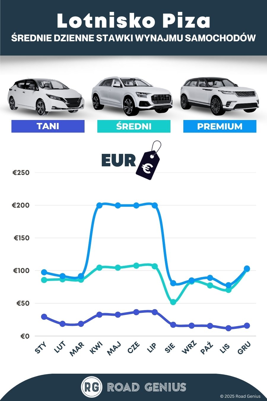 Średnio wynajem samochodu na lotnisku Pisa Airport kosztuje około €80 dziennie, a najtańsze oferty zaczynają się od €12 dziennie.