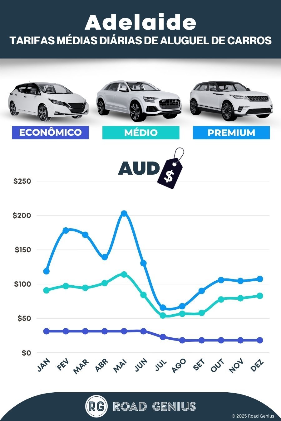 Em média, alugar um carro em Adelaide custa cerca de AUD 103 por dia, com opções a partir de AUD 18 por dia.