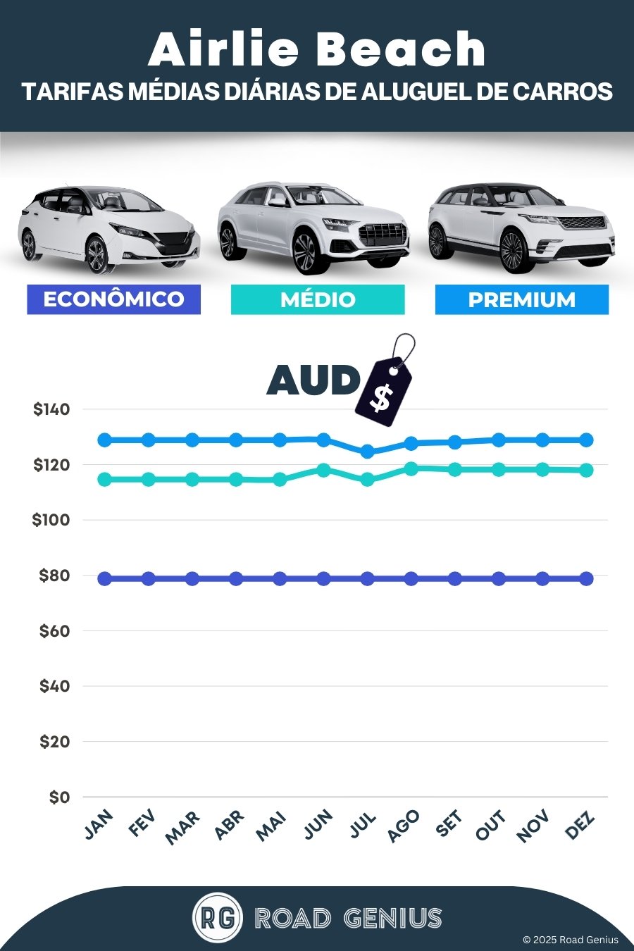 Em média, alugar um carro em Airlie Beach custa cerca de AUD 116 por dia, com opções a partir de AUD 79 por dia.