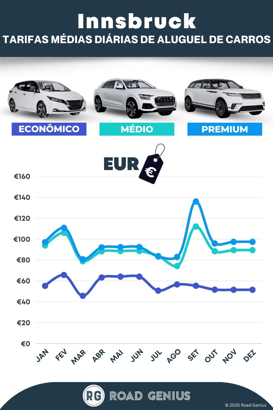 Em média, o aluguel de carros em Innsbruck custa cerca de €81 por dia, com as opções mais baratas a partir de €46 por dia.
