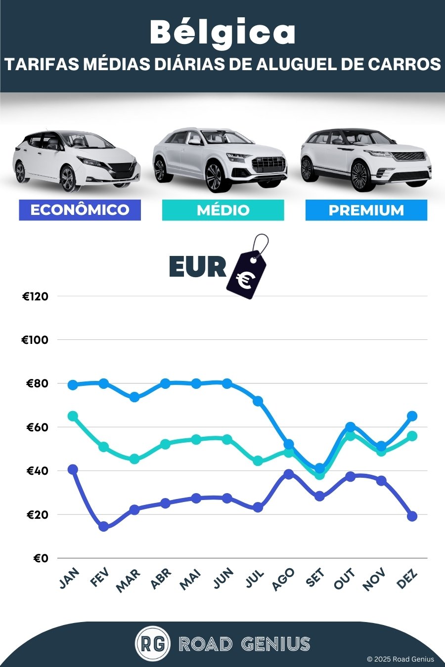 Em média, o aluguel de carros em Bélgica custa cerca de €49 por dia, com as opções mais baratas a partir de €14 por dia.