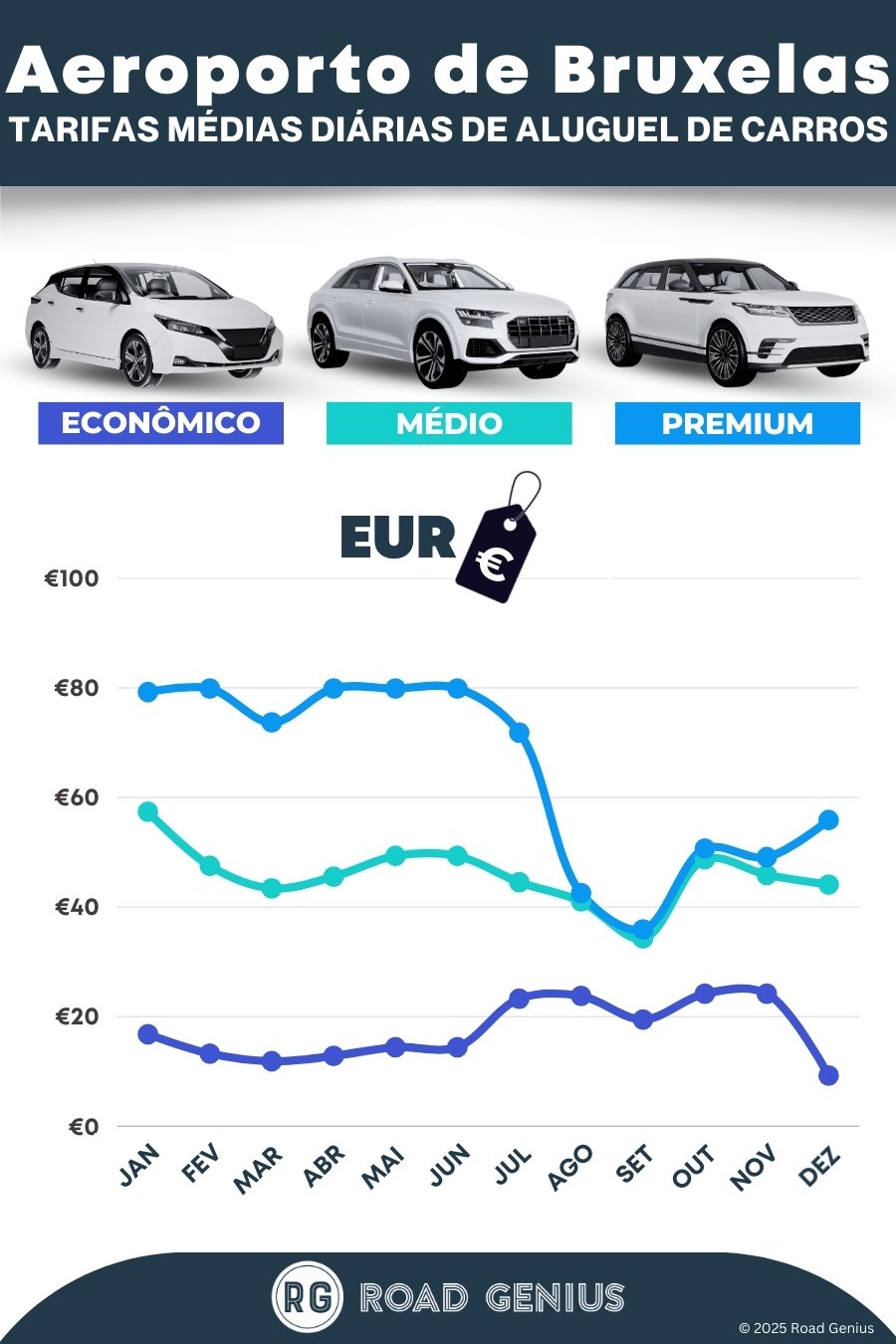 Em média, o aluguel de carros no Aeroporto de Bruxelas custa cerca de €43 por dia, com as opções mais baratas a partir de €9 por dia.
