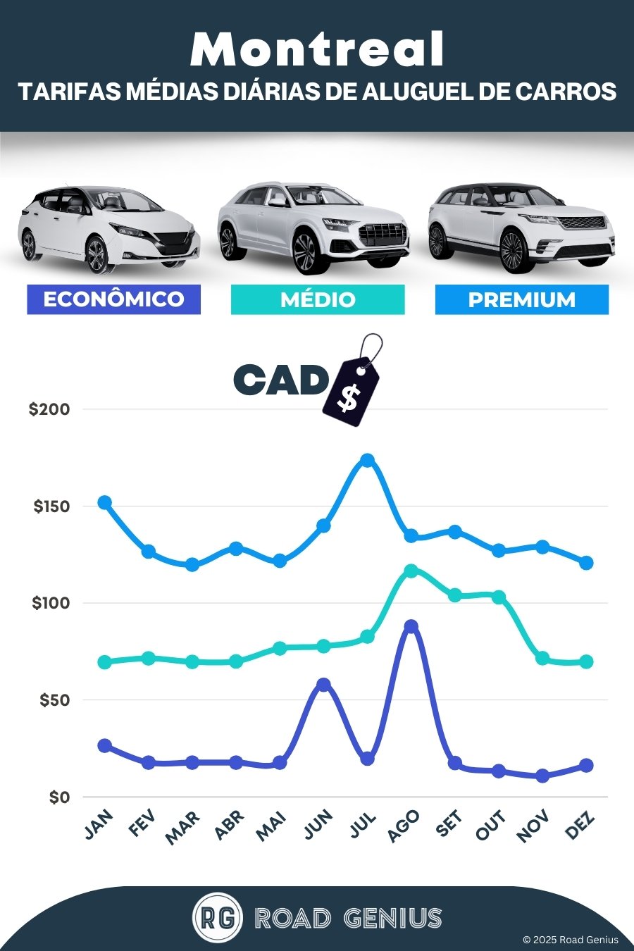 Em média, o aluguel de carros em Montreal custa cerca de CAD$ 81 por dia, com as opções mais baratas a partir de CAD$ 11 por dia.