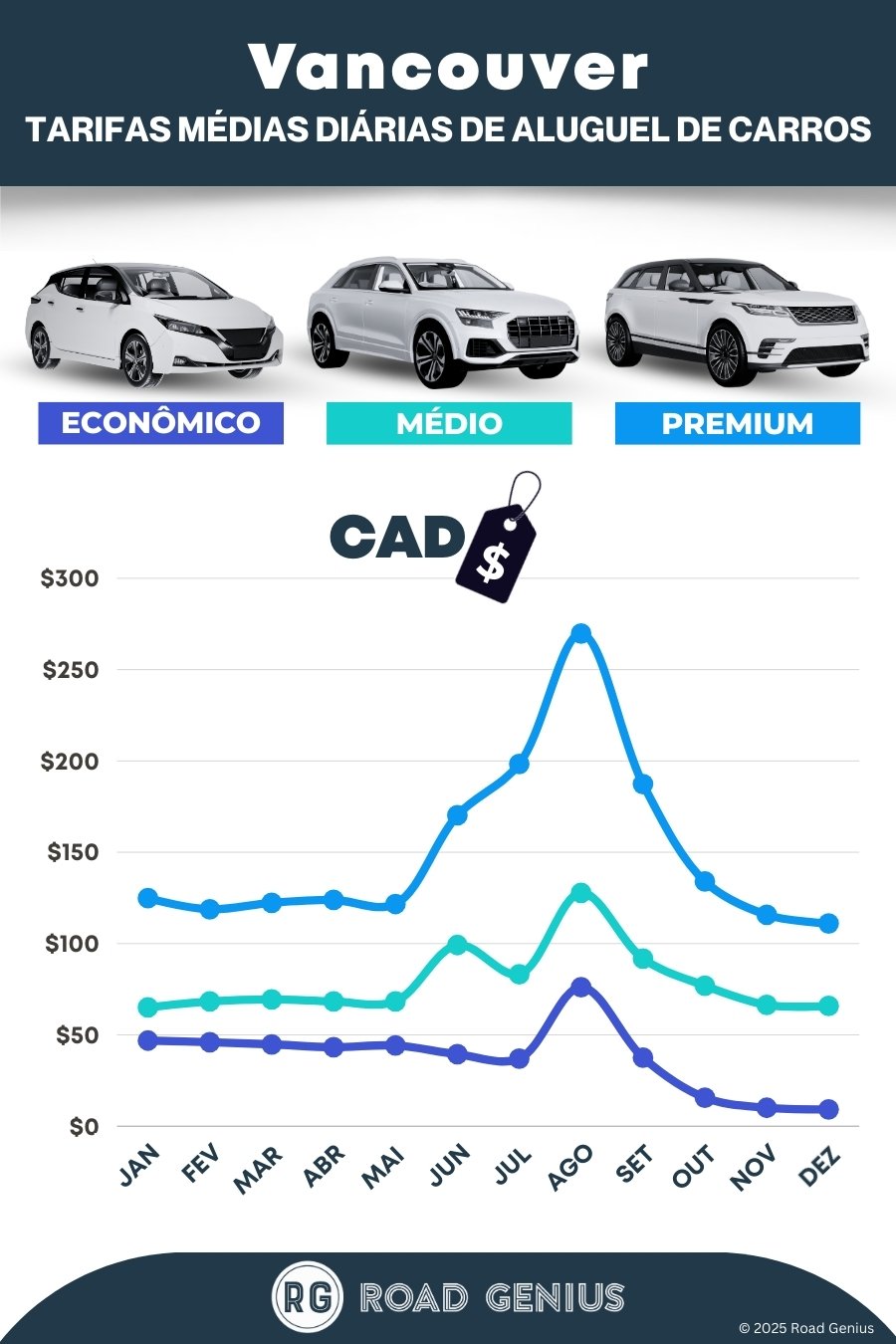 Em média, o aluguel de carros em Vancouver custa cerca de CAD$ 89 por dia, com as opções mais baratas a partir de CAD$ 9 por dia.
