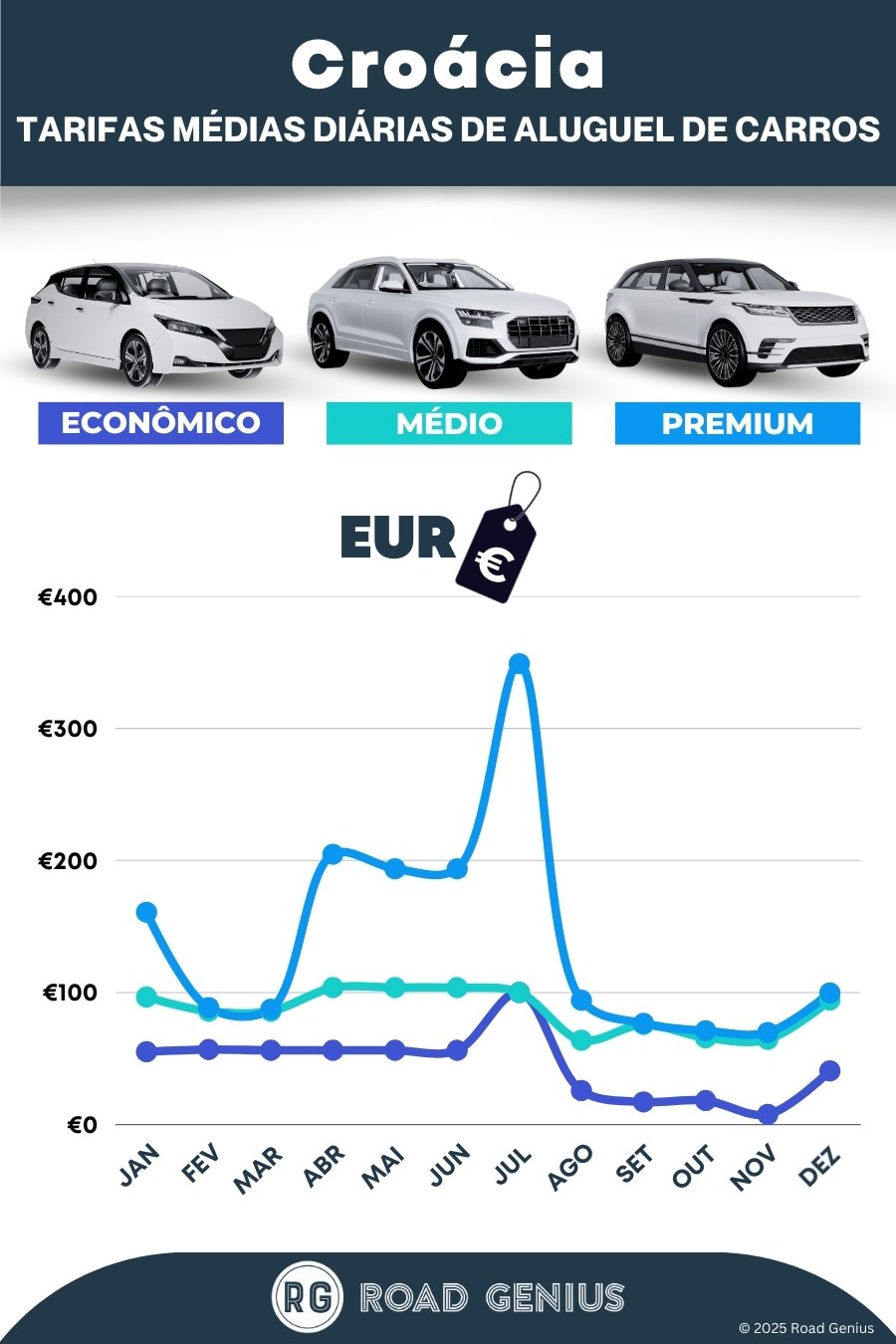 Em média, o aluguel de carros em Croácia custa cerca de €91 por dia, com as opções mais baratas a partir de €8 por dia.
