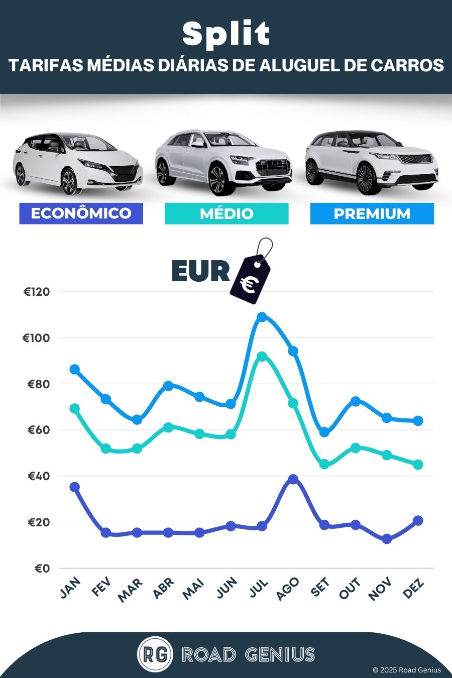 Em média, o aluguel de carros em Split custa cerca de €52 por dia, com as opções mais baratas a partir de €13 por dia.