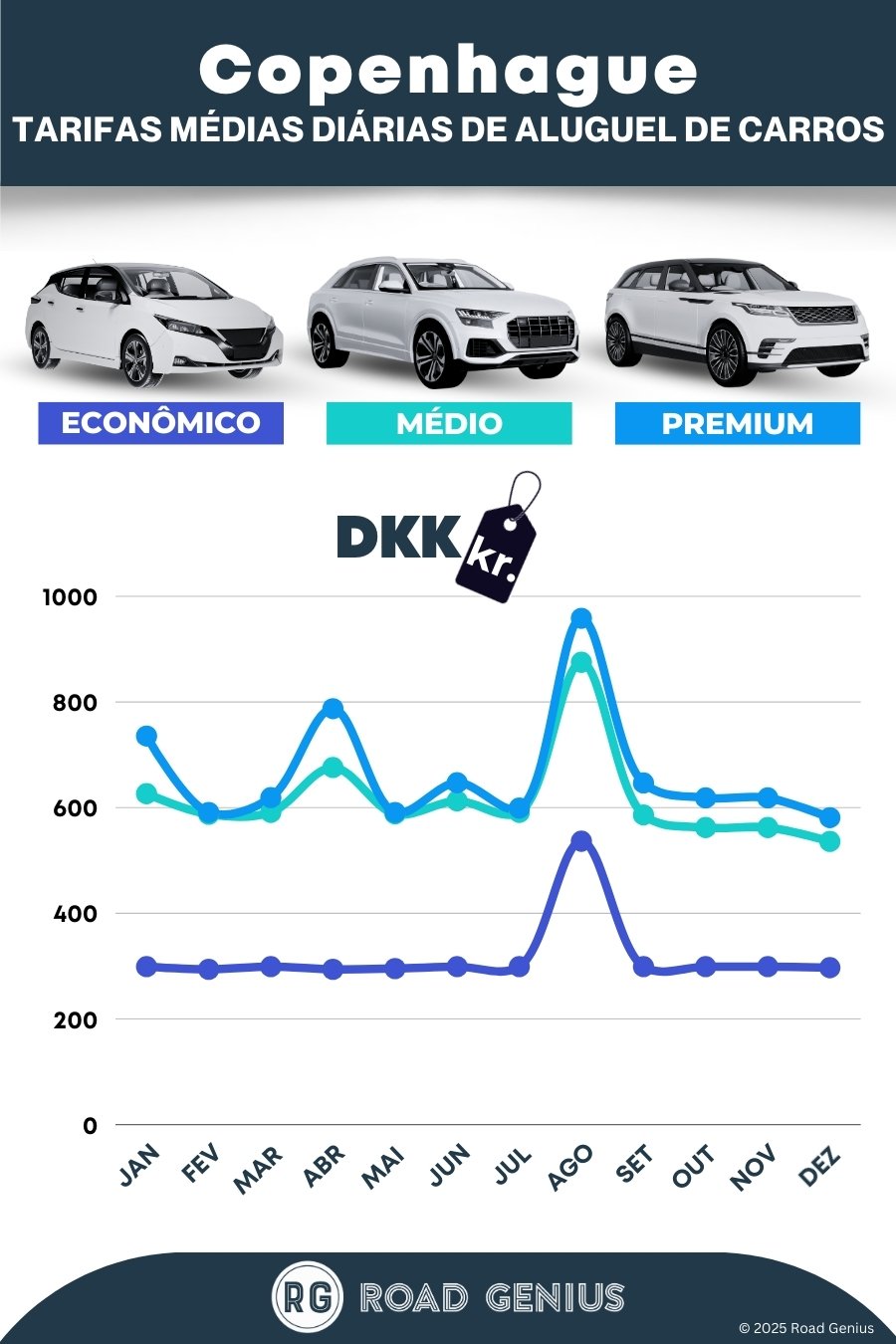 Em média, o aluguel de carros em Copenhague custa cerca de 533 kr por dia, com as opções mais baratas a partir de 294 kr por dia.