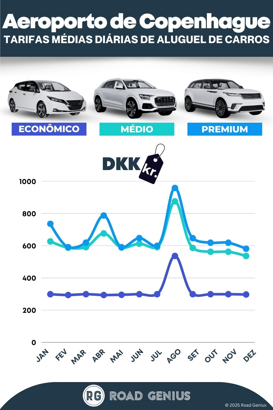 Em média, o aluguel de carros no Aeroporto de Copenhague custa cerca de 533 kr por dia, com as opções mais baratas a partir de 294 kr por dia.
