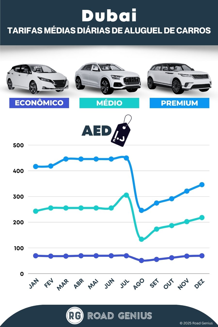 Em média, o aluguel de carros em Dubai custa cerca de 224 AED por dia, com as opções mais baratas a partir de 51 AED por dia.