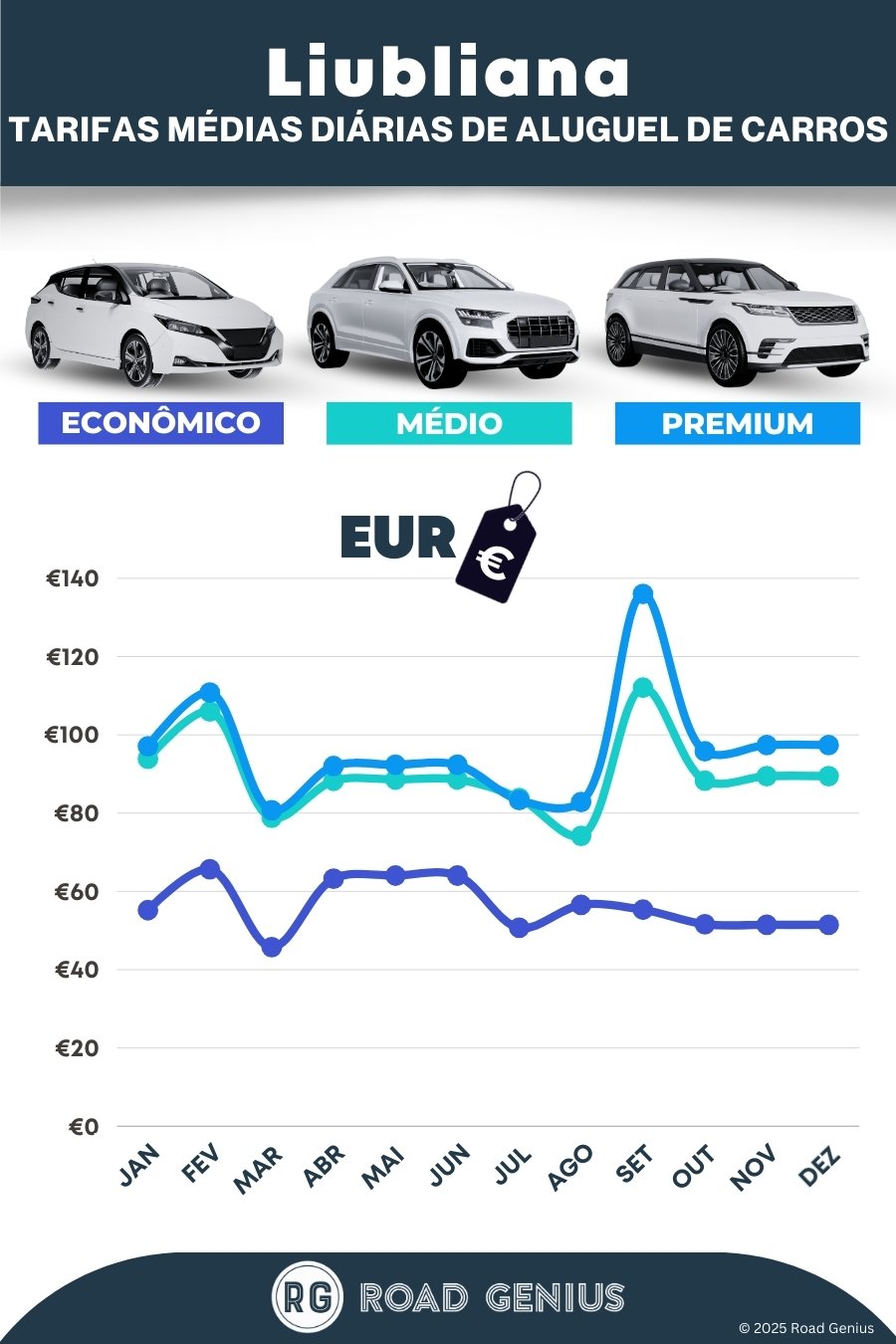Em média, o aluguel de carros em Liubliana custa cerca de €81 por dia, com as opções mais baratas a partir de €46 por dia.