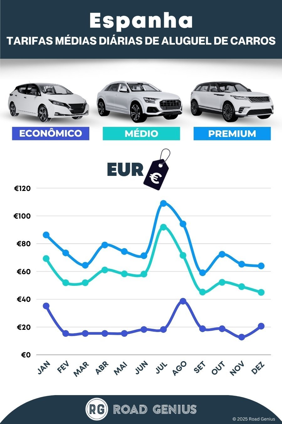 Em média, o aluguel de carros em Espanha custa cerca de €52 por dia, com as opções mais baratas a partir de €13 por dia.