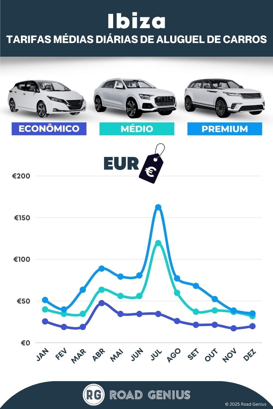 Em média, o aluguel de carros em Ibiza custa cerca de €49 por dia, com as opções mais baratas a partir de €17 por dia.
