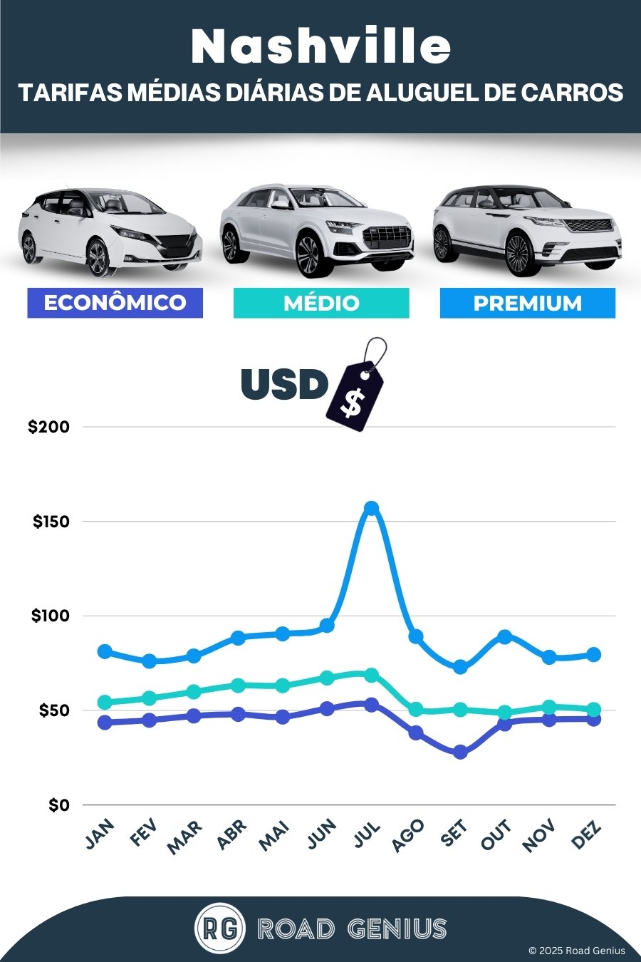 Em média, o aluguel de carros em Nashville custa cerca de USD $64 por dia, com as opções mais baratas a partir de USD $28 por dia.