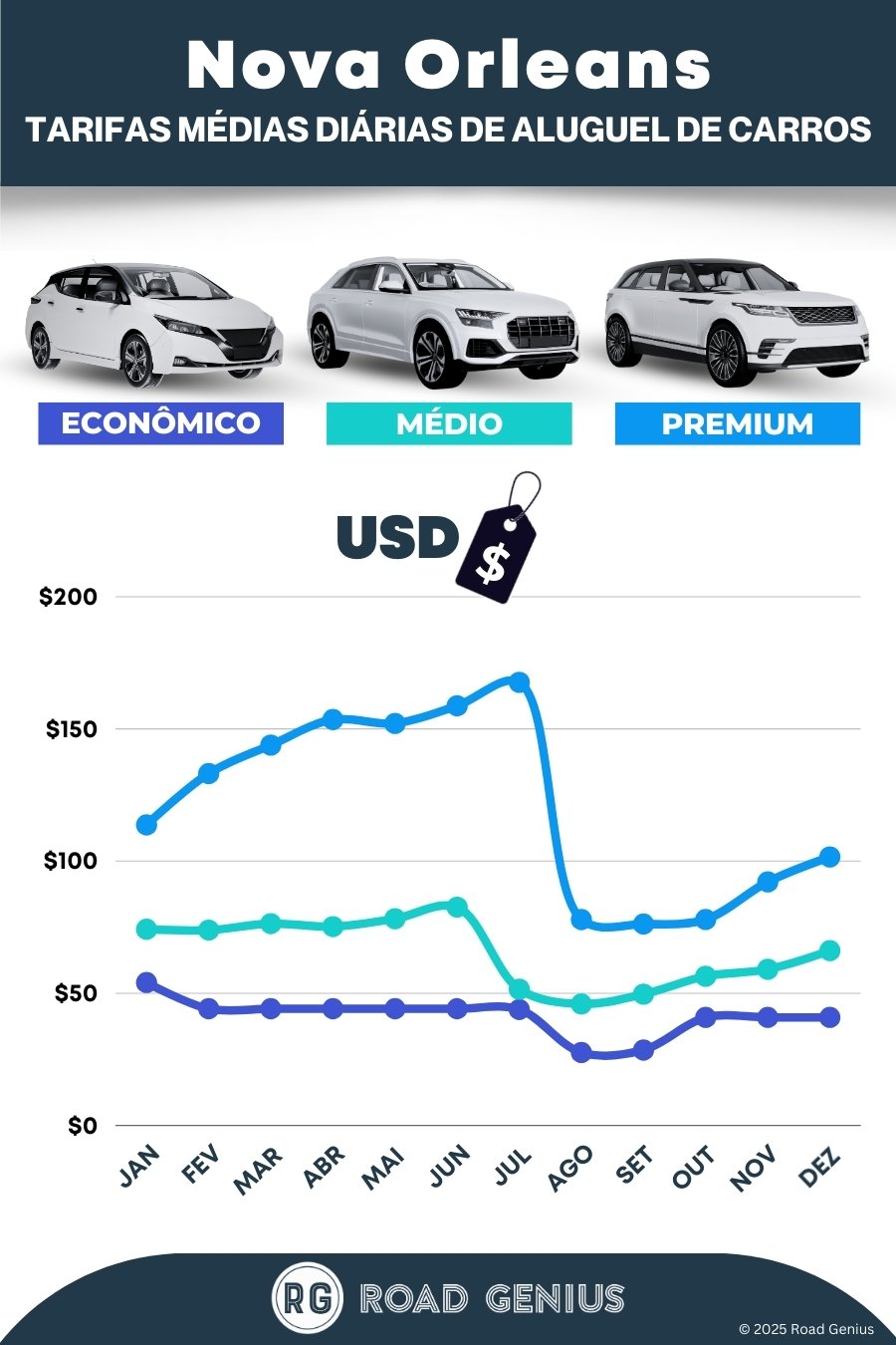 Em média, o aluguel de carros em Nova Orleans custa cerca de USD $76 por dia, com as opções mais baratas a partir de USD $28 por dia.