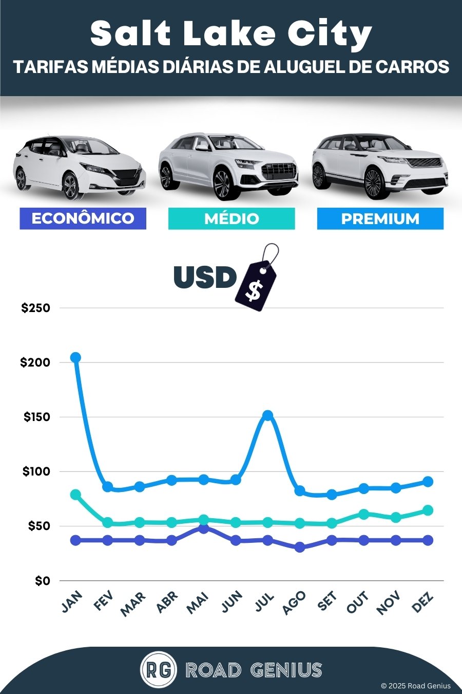 Em média, o aluguel de carros em Salt Lake City custa cerca de USD $66 por dia, com as opções mais baratas a partir de USD $31 por dia.