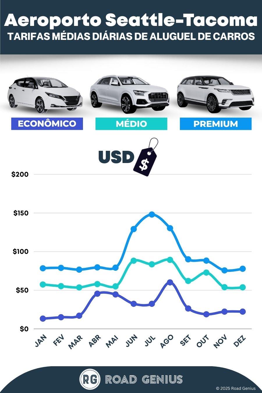 Em média, o aluguel de carros no Aeroporto de Seattle–Tacoma custa cerca de USD $63 por dia, com as opções mais baratas a partir de USD $13 por dia.