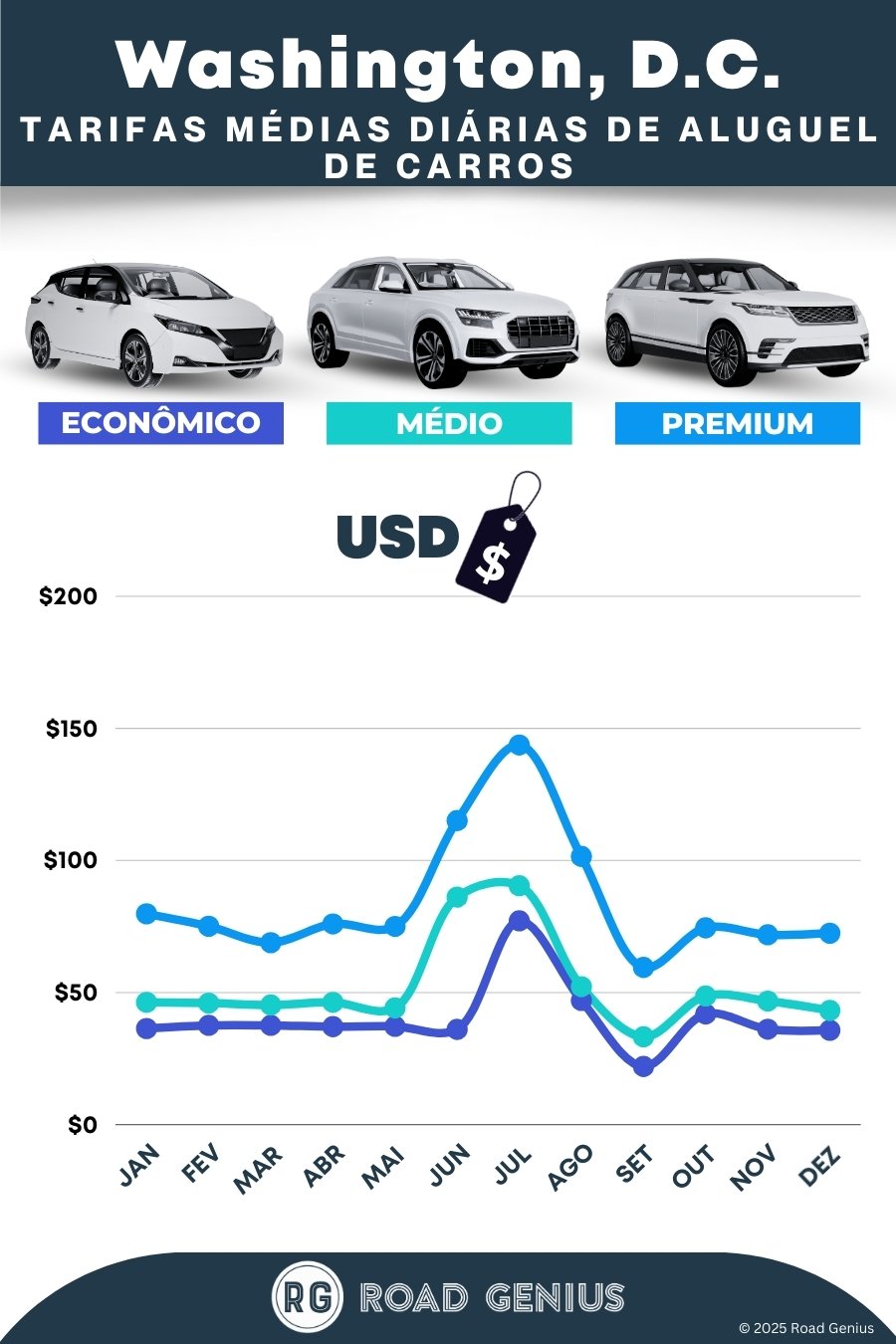 Em média, o aluguel de carros em Washington DC custa cerca de USD $59 por dia, com as opções mais baratas a partir de USD $22 por dia.