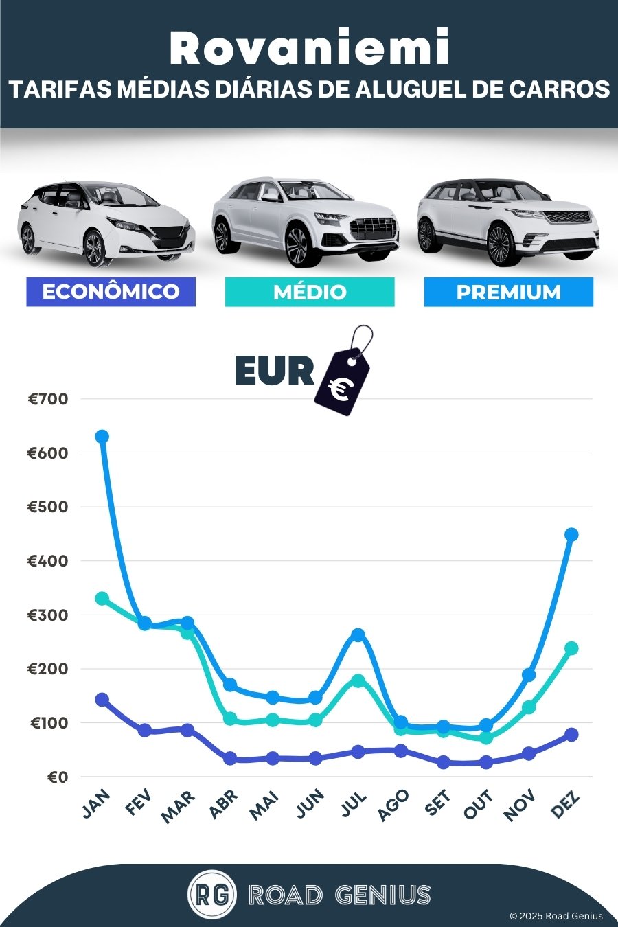 Em média, o aluguel de carros em Rovaniemi custa cerca de €153 por dia, com as opções mais baratas a partir de €27 por dia.