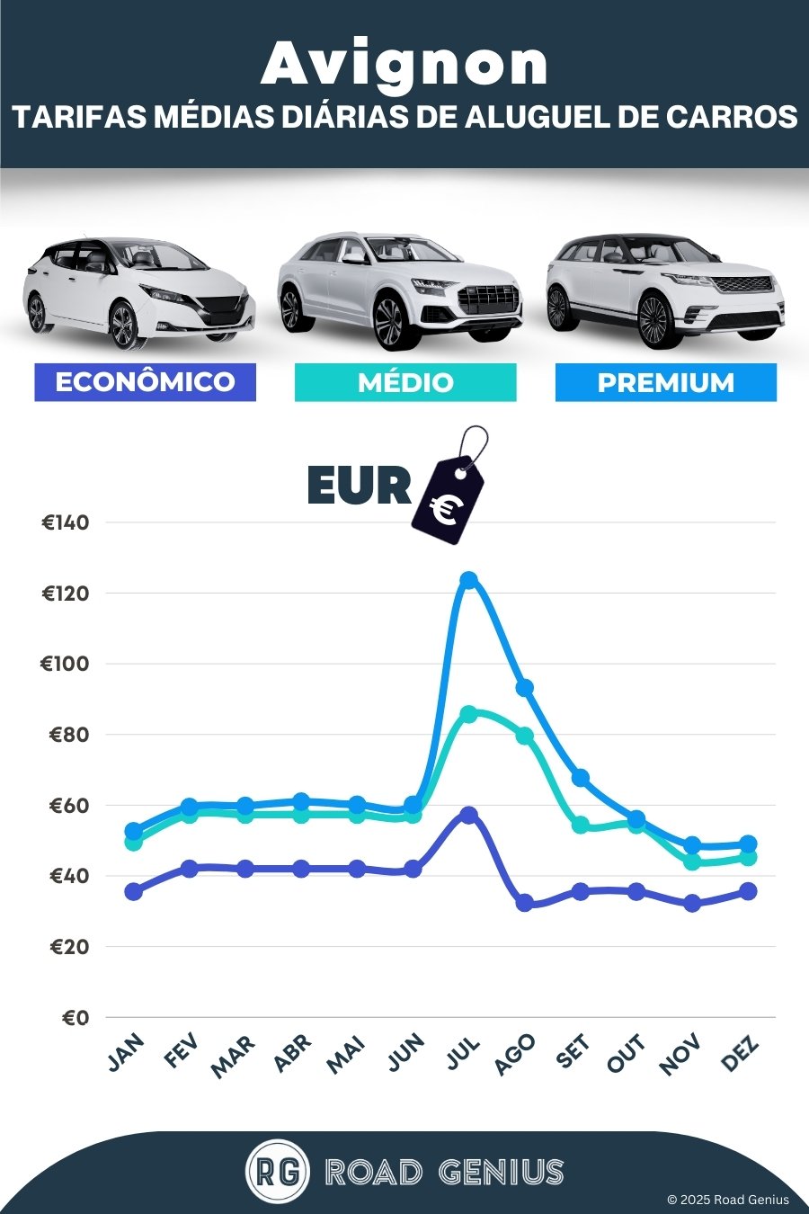 Em média, o aluguel de carros em Avignon custa cerca de €55 por dia, com as opções mais baratas a partir de €32 por dia.