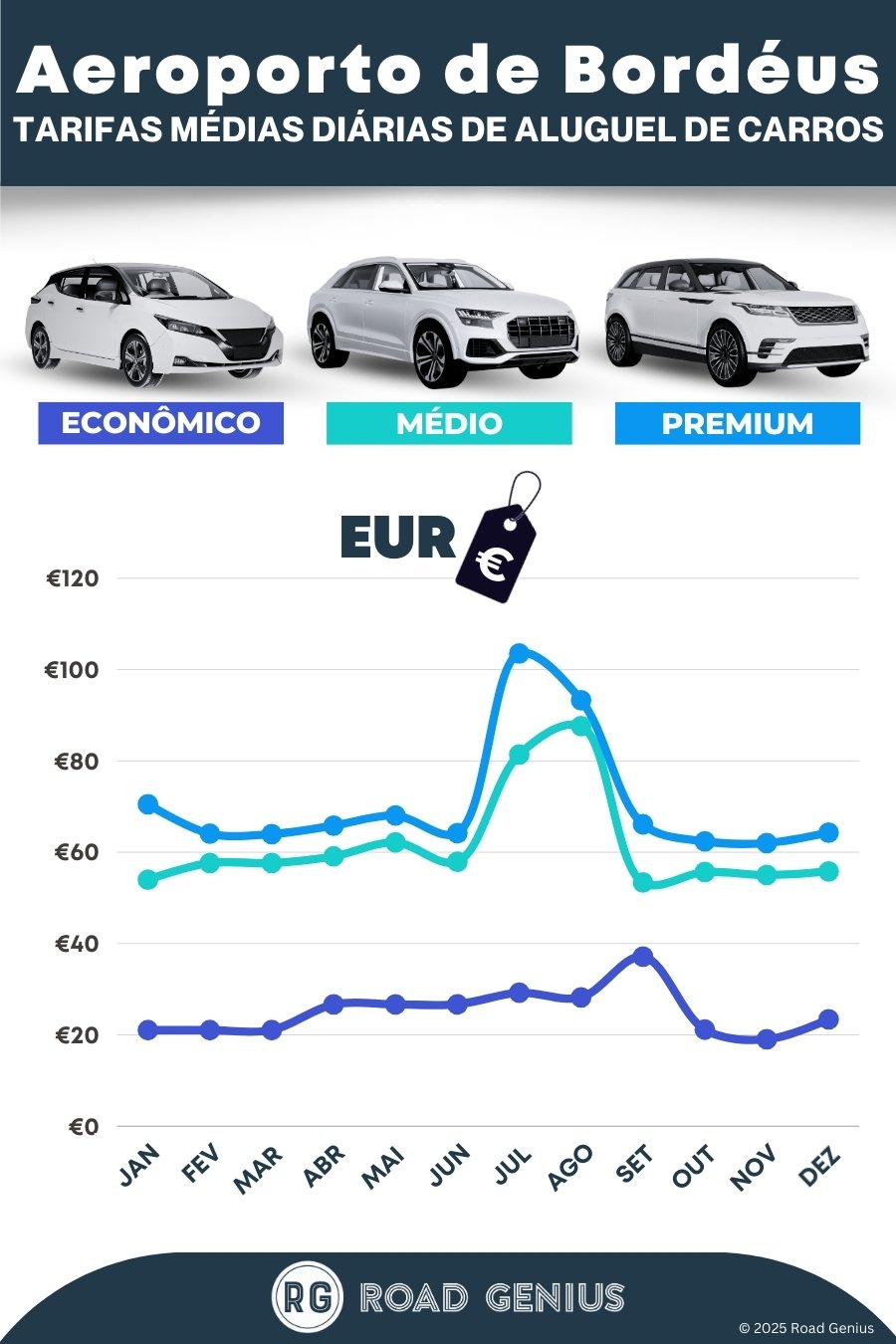Em média, o aluguel de carros no Aeroporto de Bordeaux custa cerca de €52 por dia, com as opções mais baratas a partir de €19 por dia.