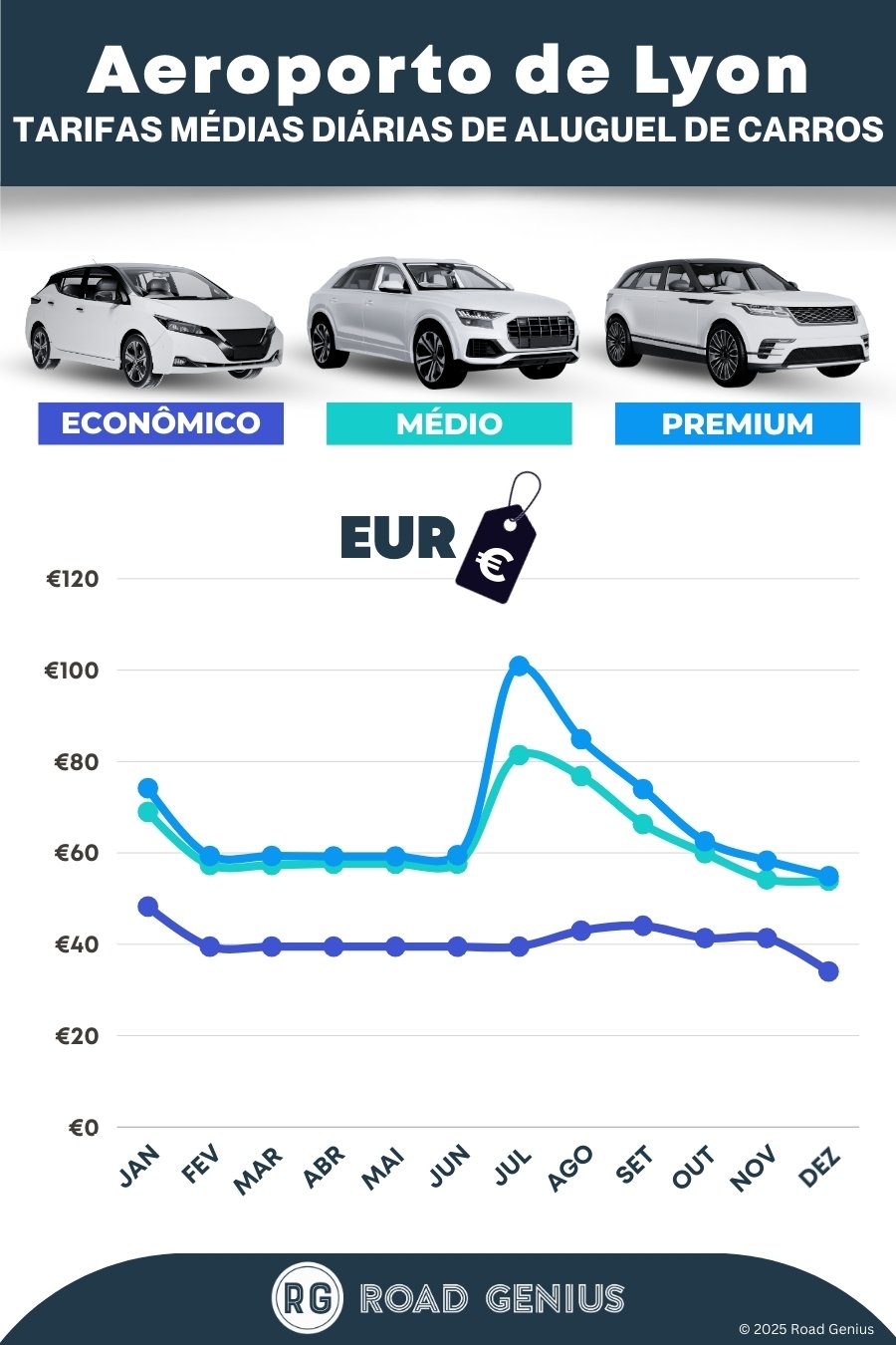 Em média, o aluguel de carros no Aeroporto de Lyon custa cerca de €57 por dia, com as opções mais baratas a partir de €34 por dia.