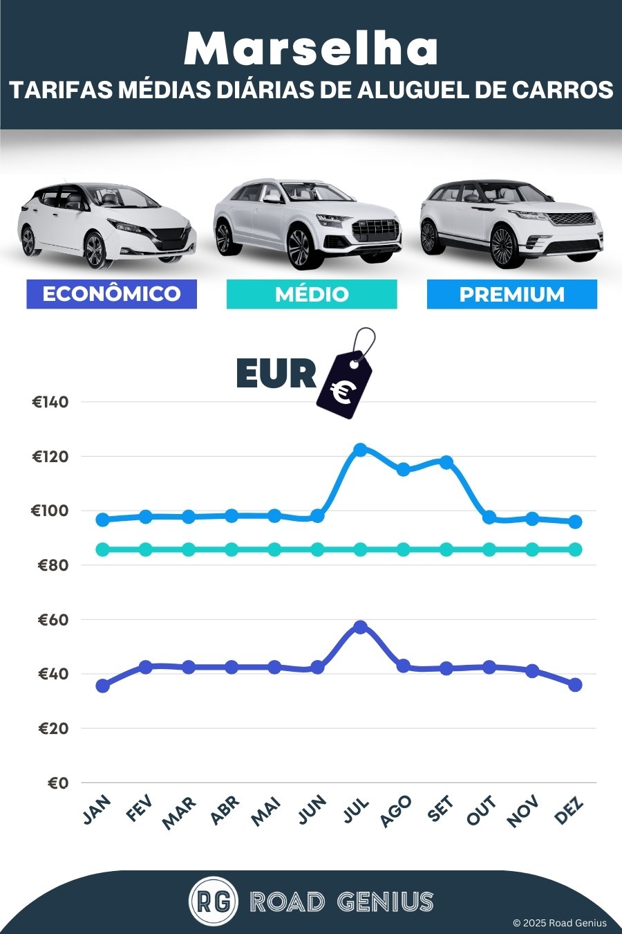 Em média, o aluguel de carros em Marselha custa cerca de €77 por dia, com as opções mais baratas a partir de €36 por dia.