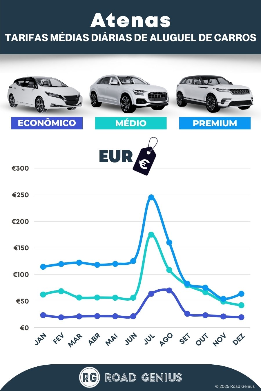 Em média, o aluguel de carros em Atenas custa cerca de €73 por dia, com as opções mais baratas a partir de €19 por dia.