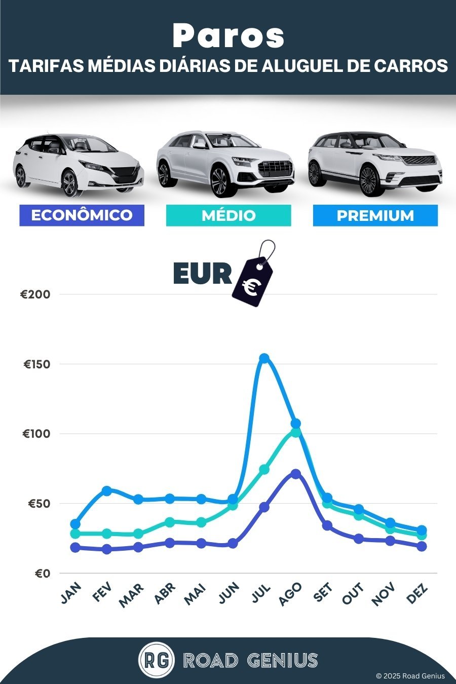 Em média, o aluguel de carros em Paros custa cerca de €45 por dia, com as opções mais baratas a partir de €17 por dia.