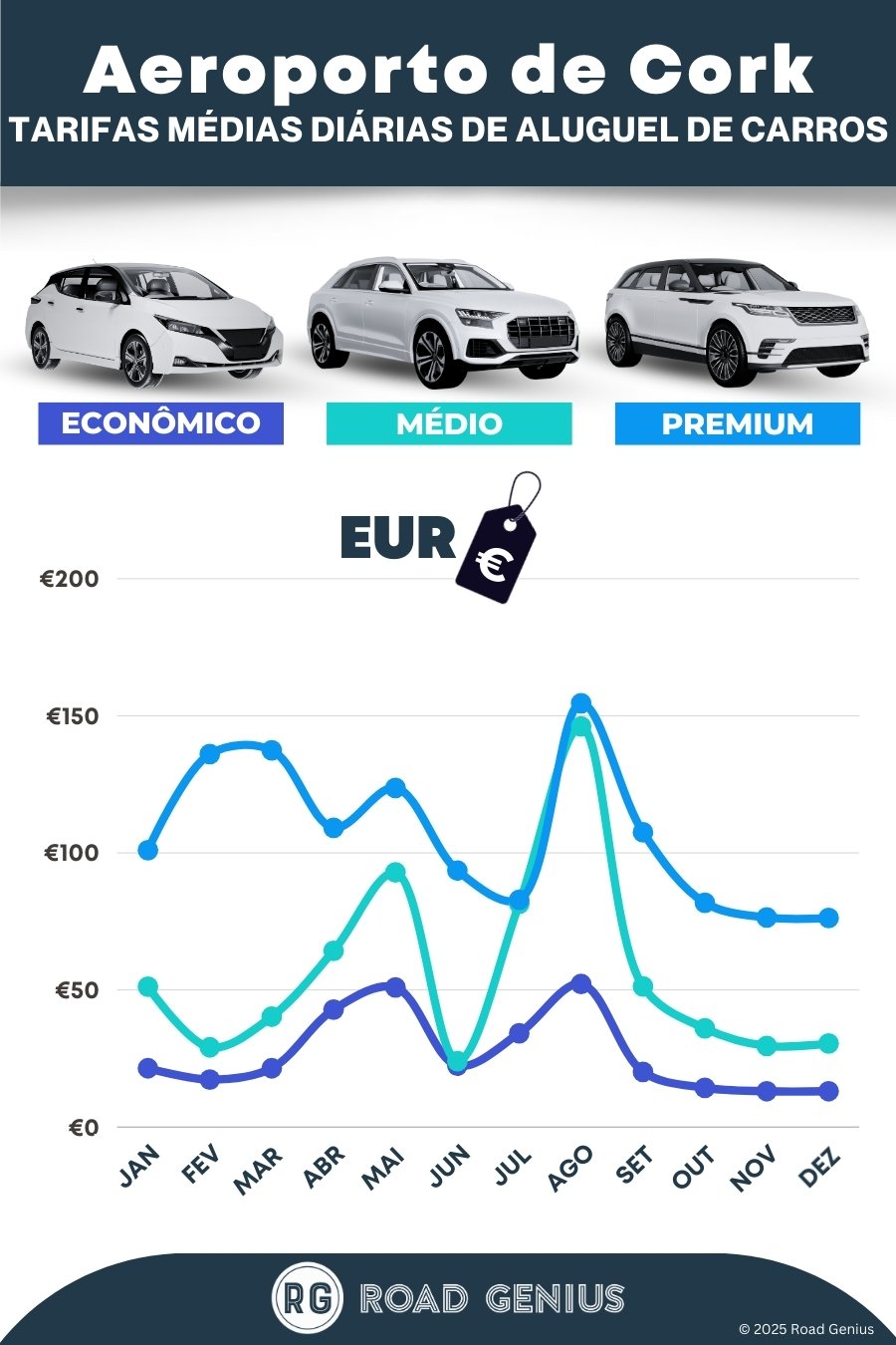 Em média, o aluguel de carros no Aeroporto de Cork custa cerca de €63 por dia, com as opções mais baratas a partir de €13 por dia.