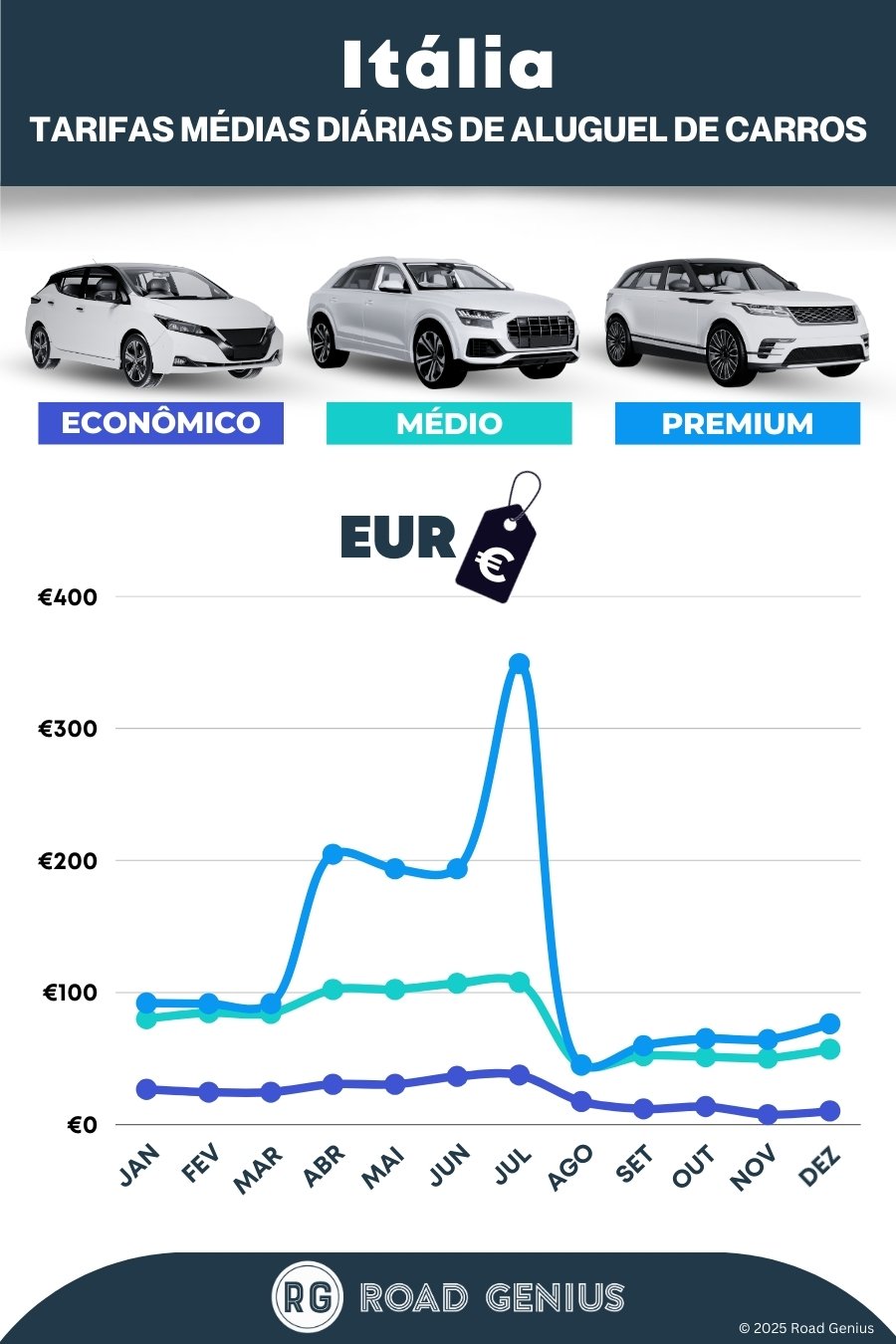 Em média, o aluguel de carros em Itália custa cerca de €76 por dia, com as opções mais baratas a partir de €8 por dia.