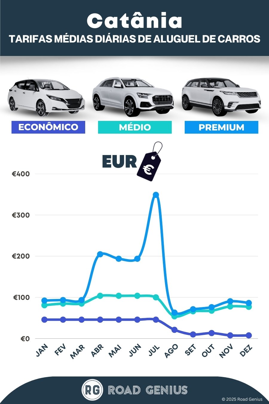 Em média, o aluguel de carros em Catânia custa cerca de €83 por dia, com as opções mais baratas a partir de €8 por dia.