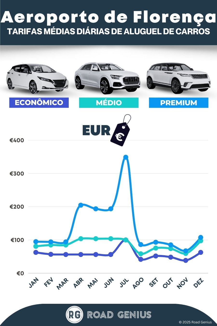 Em média, o aluguel de carros no Aeroporto de Florença custa cerca de €94 por dia, com as opções mais baratas a partir de €38 por dia.