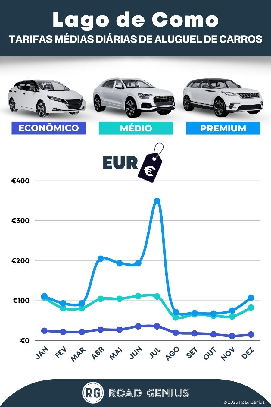 Em média, o aluguel de carros no Lago de Como custa cerca de €81 por dia, com as opções mais baratas a partir de €11 por dia.