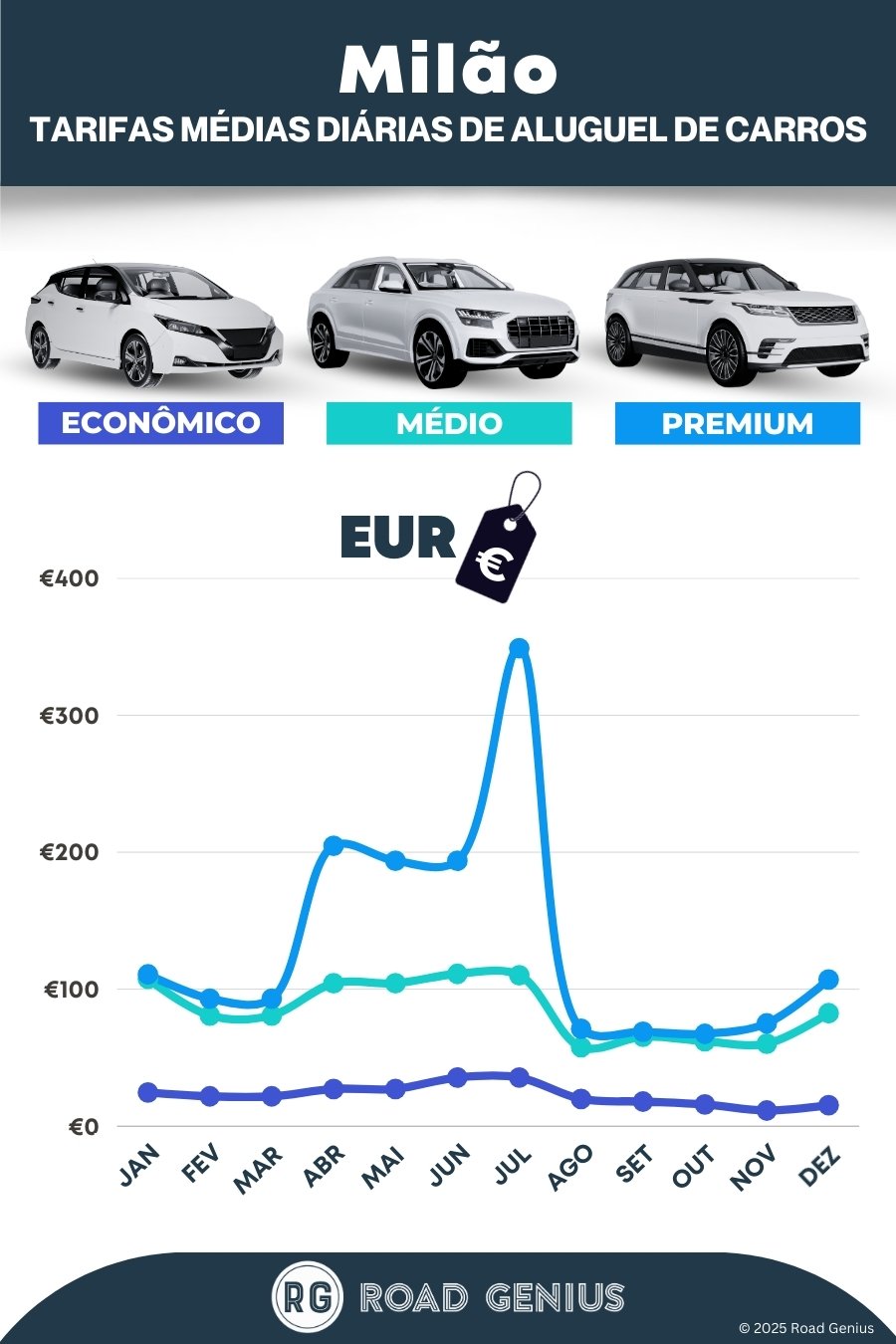 Em média, o aluguel de carros em Milão custa cerca de €81 por dia, com as opções mais baratas a partir de €11 por dia.