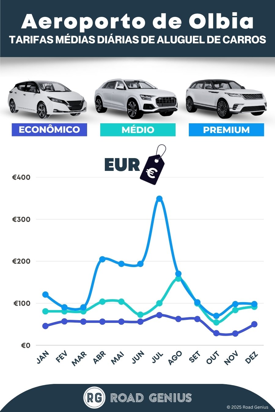 Em média, o aluguel de carros no Aeroporto de Olbia custa cerca de €98 por dia, com as opções mais baratas a partir de €28 por dia.