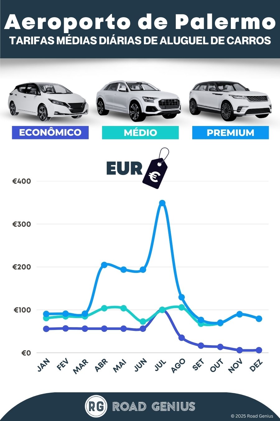 Em média, o aluguel de carros no Aeroporto de Palermo custa cerca de €89 por dia, com as opções mais baratas a partir de €6 por dia.