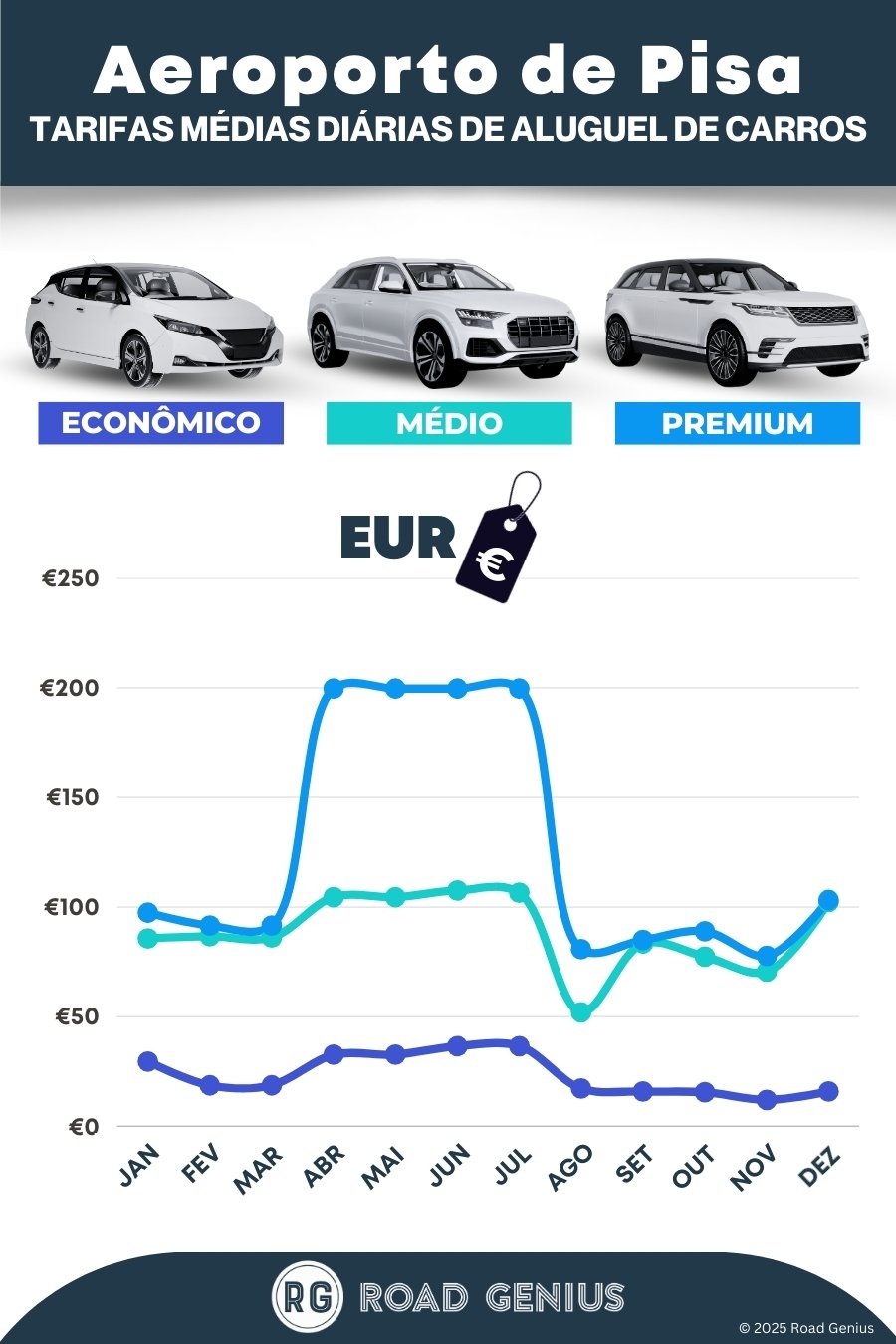 Em média, o aluguel de carros no Aeroporto de Pisa custa cerca de €80 por dia, com as opções mais baratas a partir de €12 por dia.