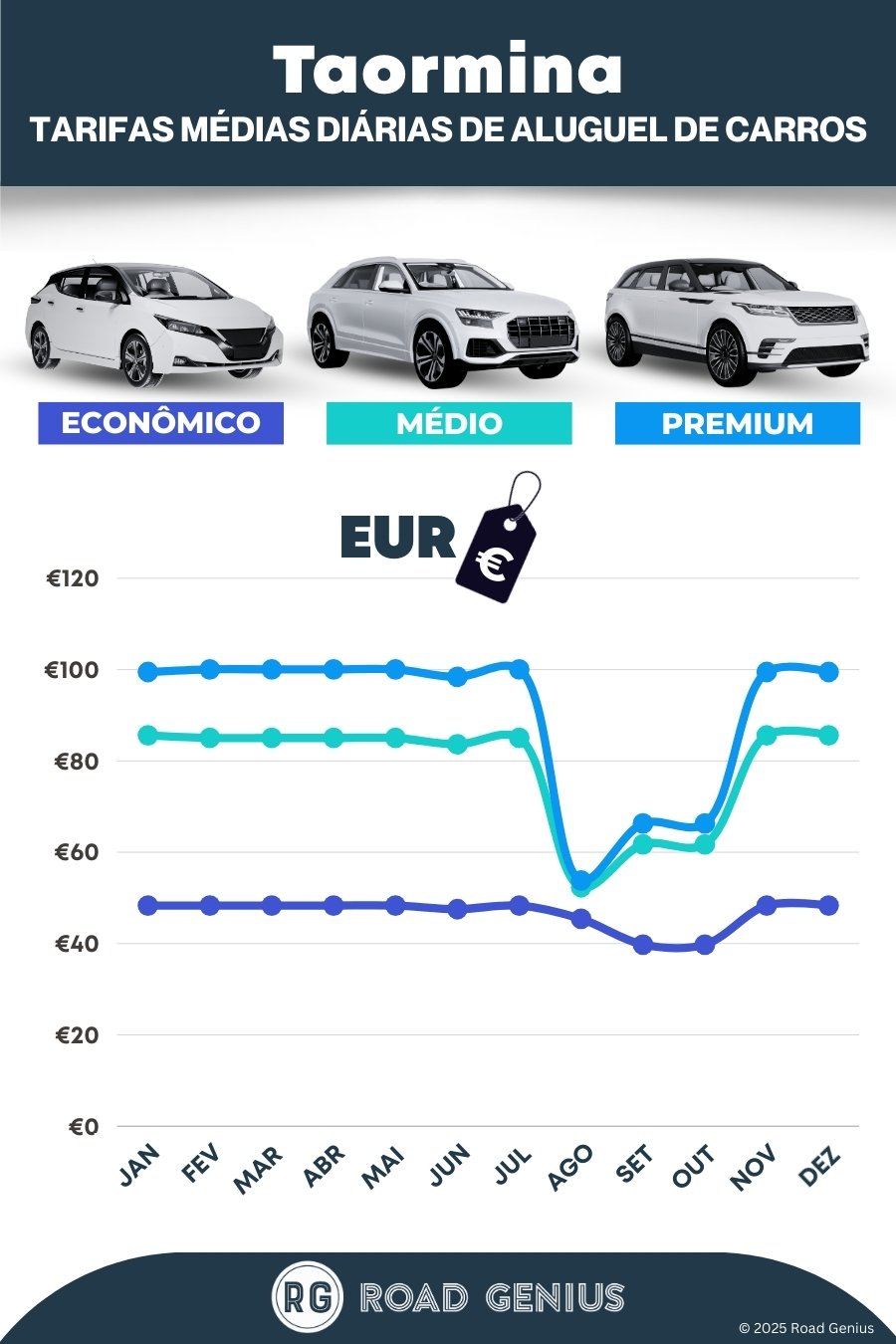 Em média, o aluguel de carros em Taormina custa cerca de €72 por dia, com as opções mais baratas a partir de €40 por dia.