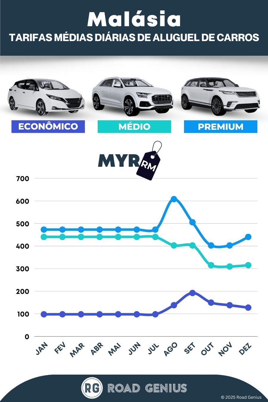 Em média, o aluguel de carros em Malásia custa cerca de 331 MYR por dia, com as opções mais baratas a partir de 98 MYR por dia.