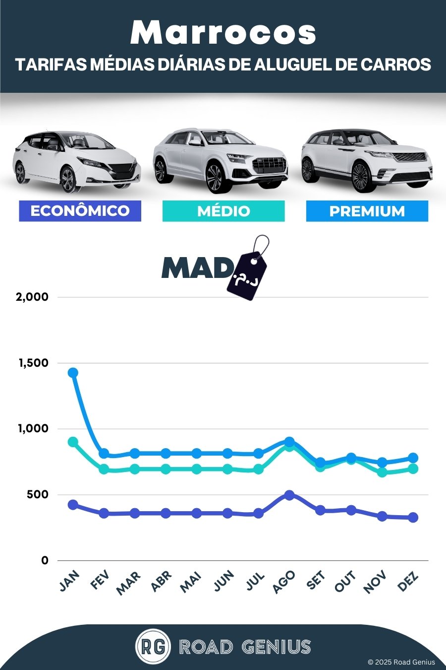 Em média, o aluguel de carros em Marrocos custa cerca de MAD dh654 por dia, com as opções mais baratas a partir de MAD dh328 por dia.