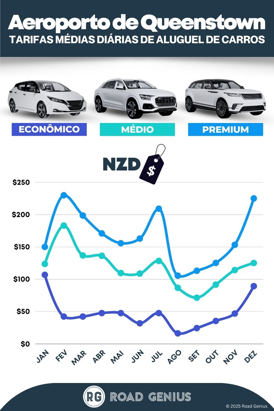 Em média, o aluguel de carros no Aeroporto de Queenstown custa cerca de NZD$111 por dia, com as opções mais baratas a partir de NZD$16 por dia.