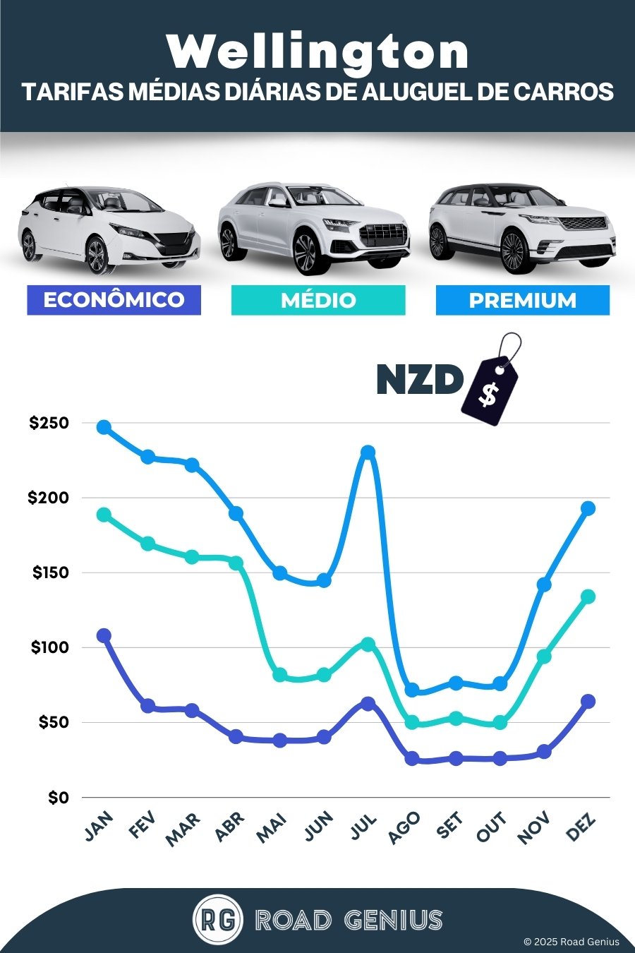 Em média, o aluguel de carros em Wellington custa cerca de NZD$108 por dia, com as opções mais baratas a partir de NZD$26 por dia.