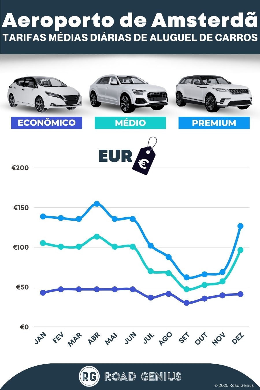 Em média, o aluguel de carros no Aeroporto de Amsterdã custa cerca de €80 por dia, com as opções mais baratas a partir de €30 por dia.