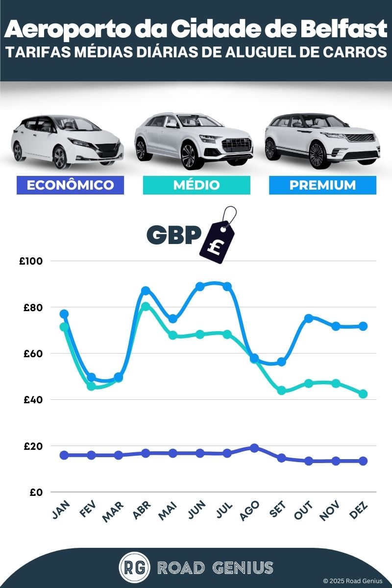 Em média, o aluguel de carros no Aeroporto de Belfast City custa cerca de €48 por dia, com as opções mais baratas a partir de €13 por dia.